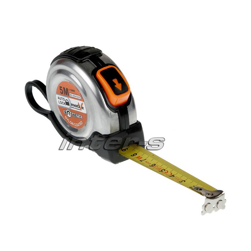 Miara stalowa 5m MOTIVE - Miara zwijana pokryta nylonem w bimateriałowej obudowie i magnetyczną końcówką zamocowaną na trzy nity. Wykonana w klasie dokładności II. Posiada funkcję automatycznej blokady. Stalowy zaczep i pasek na przegub ręki.